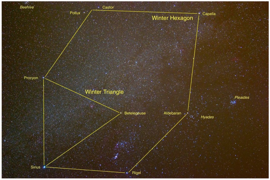 Winter Hexagon Capella–Pollux–Procyon–Sirius–Rigel–Aldebaran–Capella