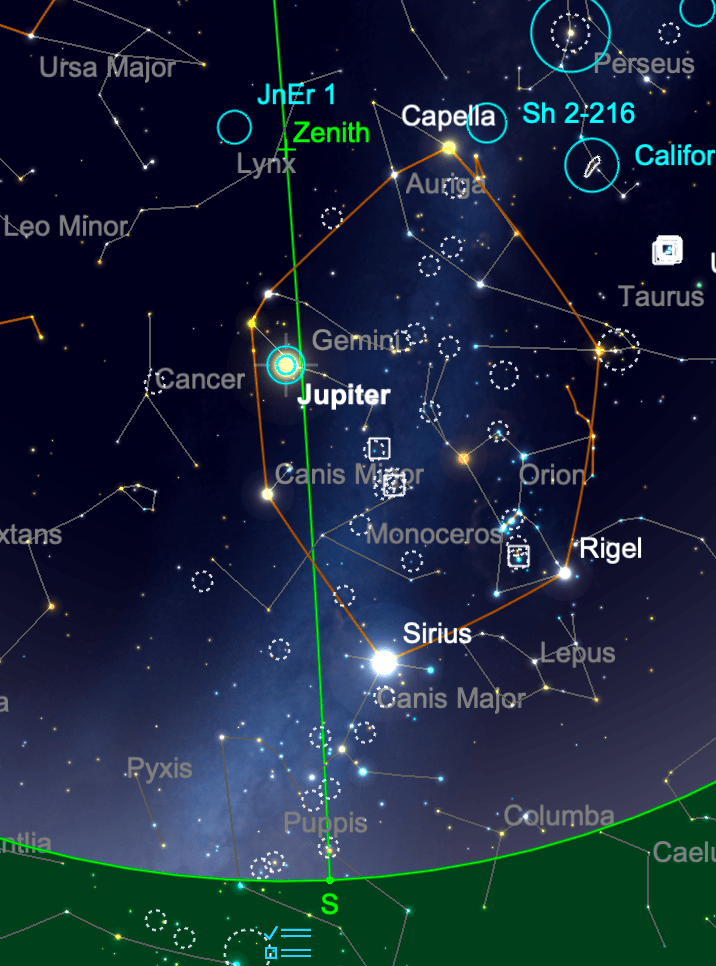 – Jupiter at Opposition – mag. -2.5, 46 arc seconds in Gemini