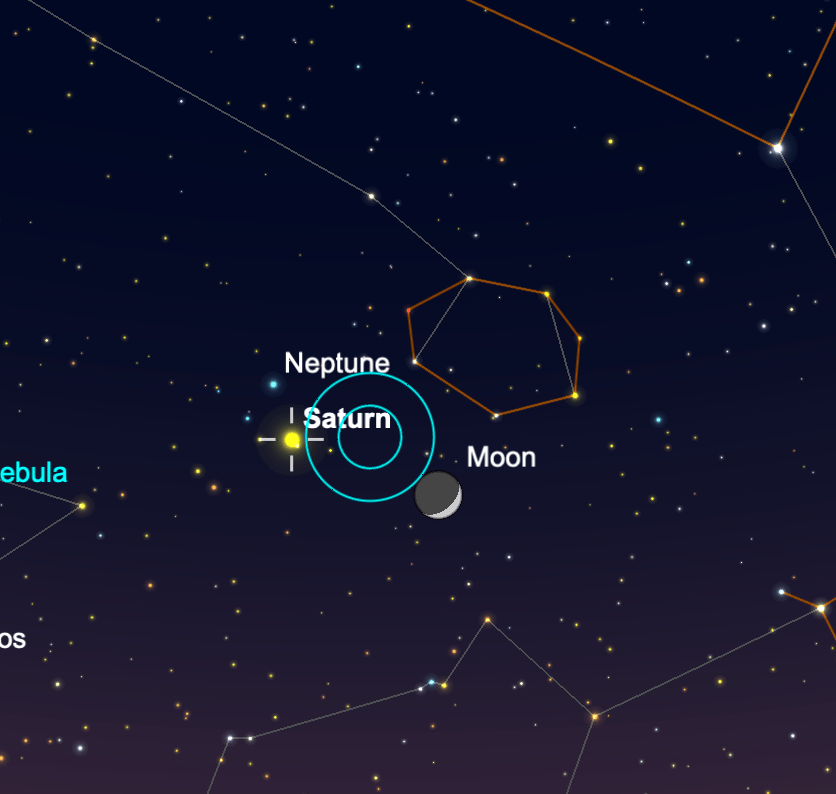Jan 23 Saturn, Neptune 4-degrees S of Moon