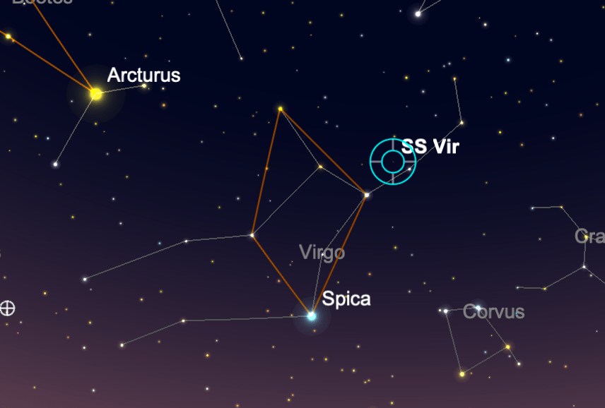 24 Long period variable carbon star max. SS Vir 11:00 pm