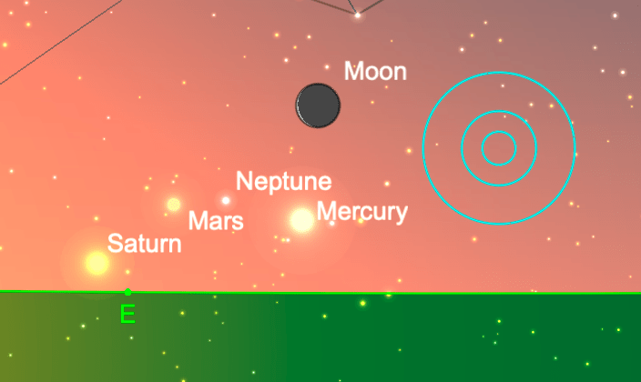 Mid- April – Moon, Mercury, Neptune, Mars, Saturn all congregate in morning sky – they are LOW